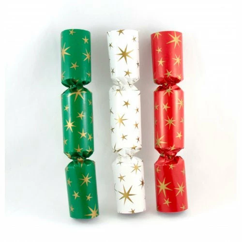 Our 8 inch paper bon bons are available in an assorted box of 100 with Red, Green & White with gold stars.