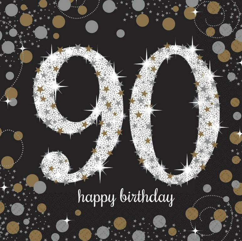 Sparkling Black 90th Birthday Lunch Napkins Black, Gold & Silver 33cm x 33cm 2 Ply Pack of 16