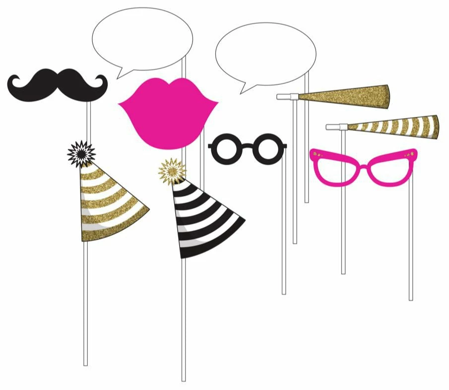 Black & Gold Photo Booth Props Assorted Sizes & Plastic Sticks Pack of 10