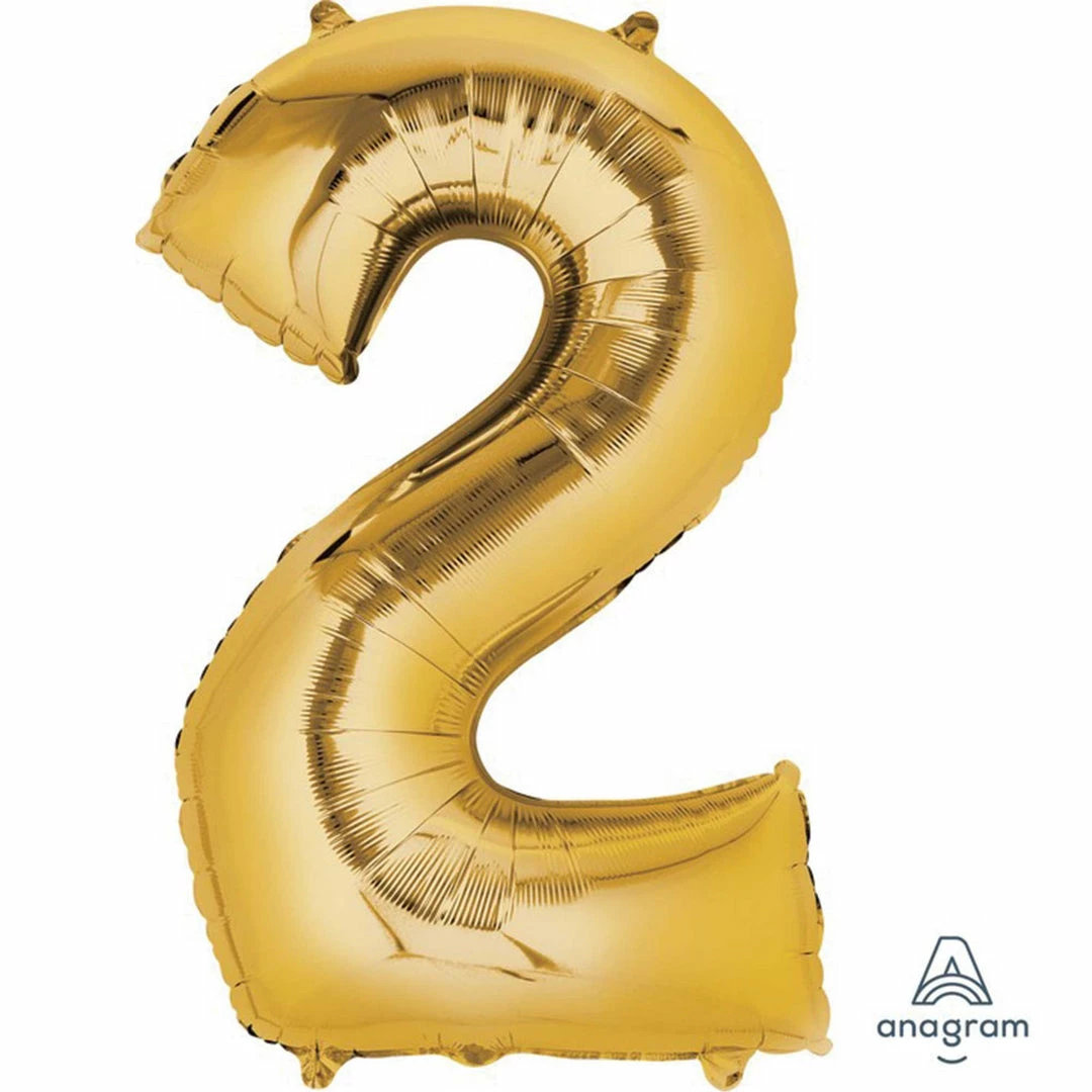Shape Number TWO Gold, Helium Saver (86cm High) Foil Balloon Self seal Balloon, Air-filled or Helium filled) Each