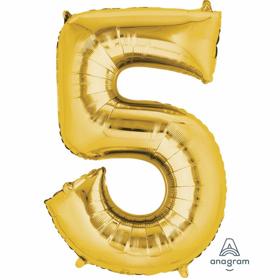 Shape Number Five Gold, Helium Saver (86cm High) Foil Balloon Self seal Balloon, Air-filled or Helium filled) Each