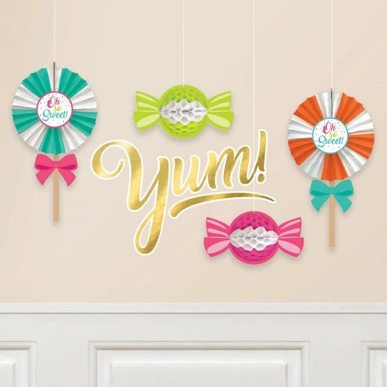 Cardboard, Paper & Foil Contains: 2 x 54cm Fans, 2 x 35cm Sweets, 1 x 39cm Cutout, 1 x 37cm Cutout & 1 x 35cm Cutout