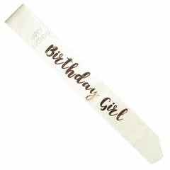 - White silk sash with rose gold brush-lettered lettering