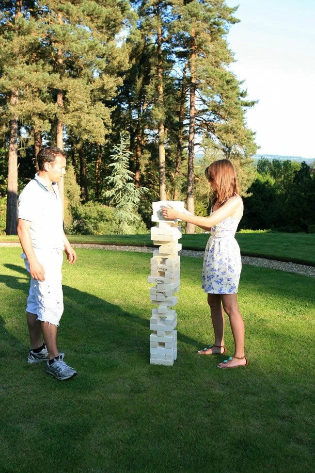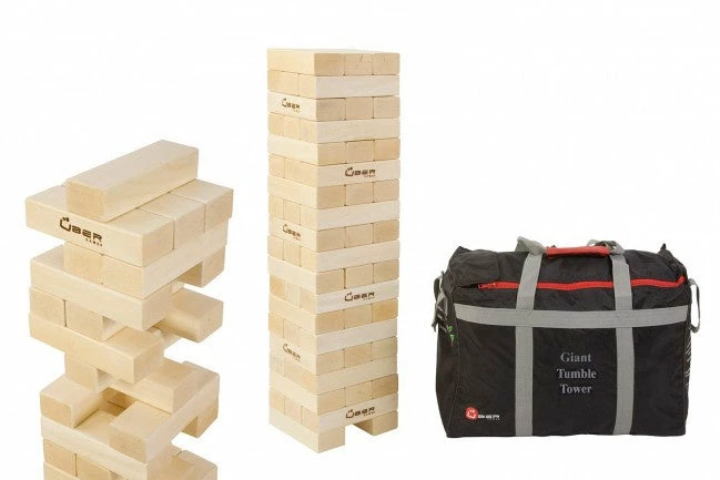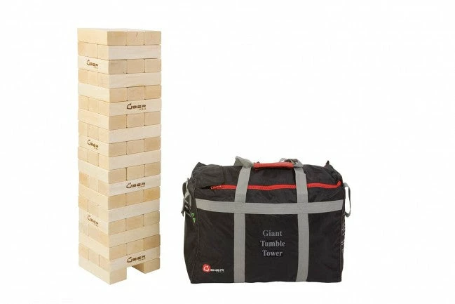 The traditional game resized to giant proportions! This is our premium quality Tower game. It consists of 56 beautifully-crafted polished hardwood blocks, building a 19 level tower of 85cm at the start of the game.Â