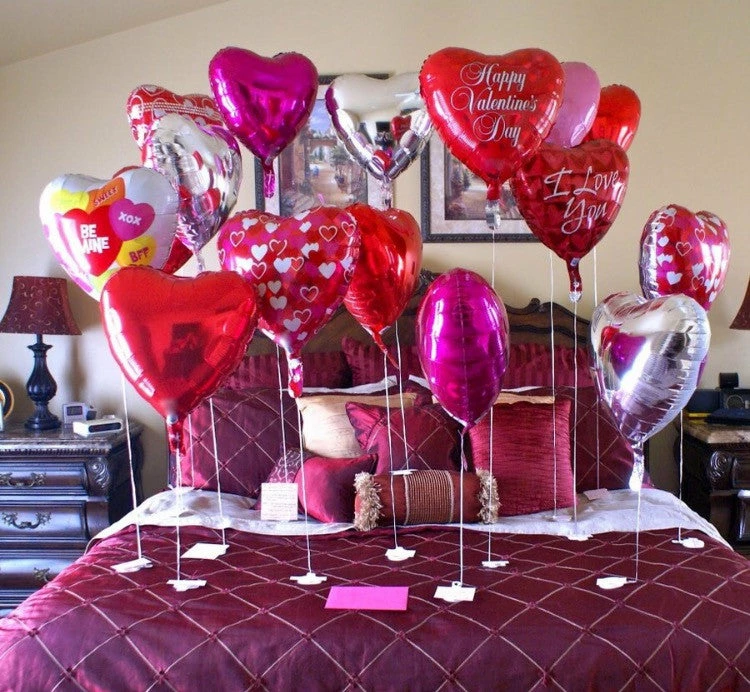 45cm Heart Printed & Plain Balloons floating from Bed with helium, will put a smile on the one you love on Valentines Day.