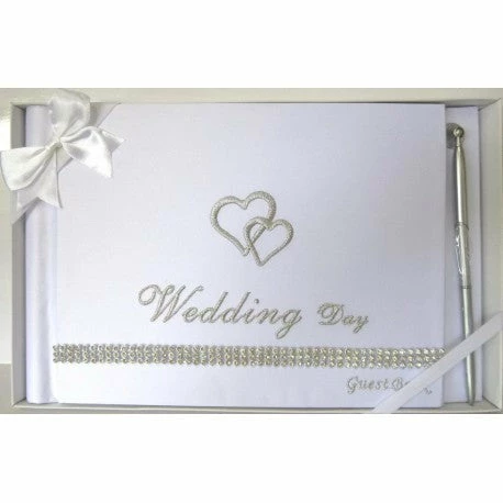 Wedding 40 Page Guestbook with Pen, White material with hearts entwined & diamantes strip 31cm x 20cm Each