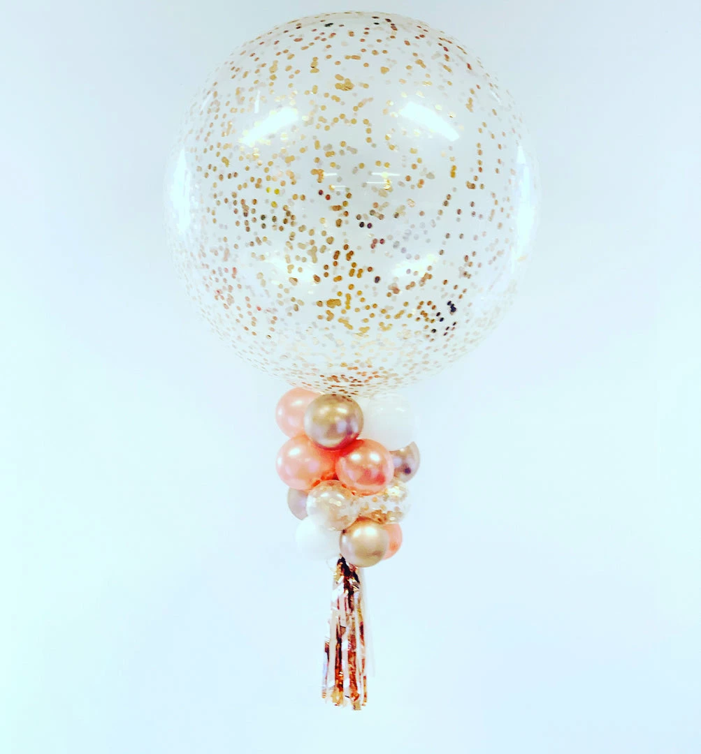 1 x 90cm Confetti Balloon with 12cm balloons underneath with tassels to match.